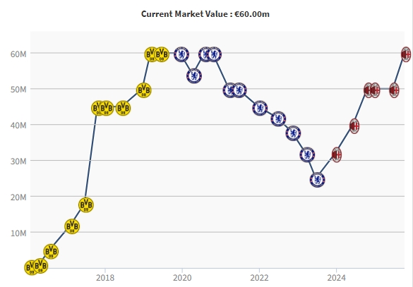 Pulisic trị giá 60 triệu euro khi anh chơi cho Dortmund và Chelsea vào năm 2019 và 2020, và kể từ đó đã giảm xuống còn 25 triệu euro.